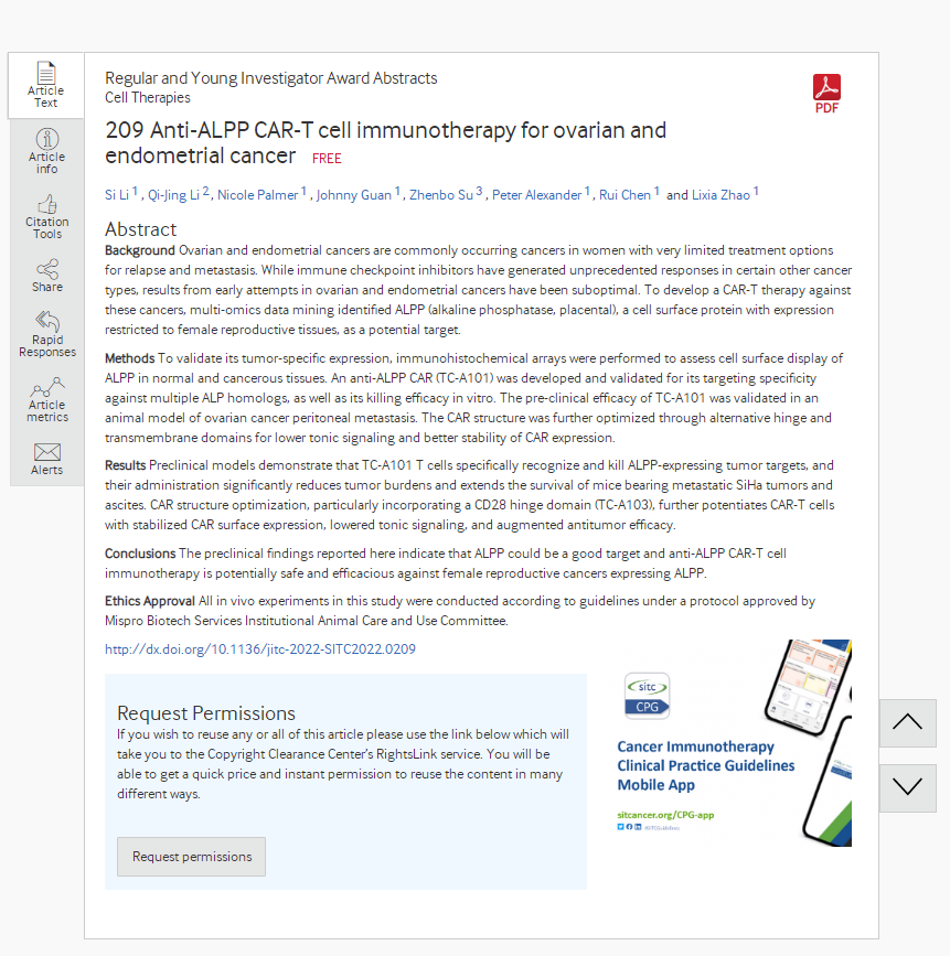 在本次盛會上,天科雅生物以壁報形式展示”首個用于泛婦科腫瘤的CAR-T細胞免疫療法“ 臨床前研發(fā)及初步的臨床試驗結果。